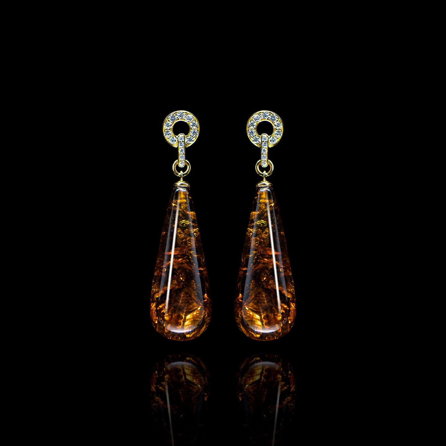 These timelessly elegant Art Deco style earrings feature luminous amber drops with circular diamond pavé fittings handcrafted in 18ct yellow gold.