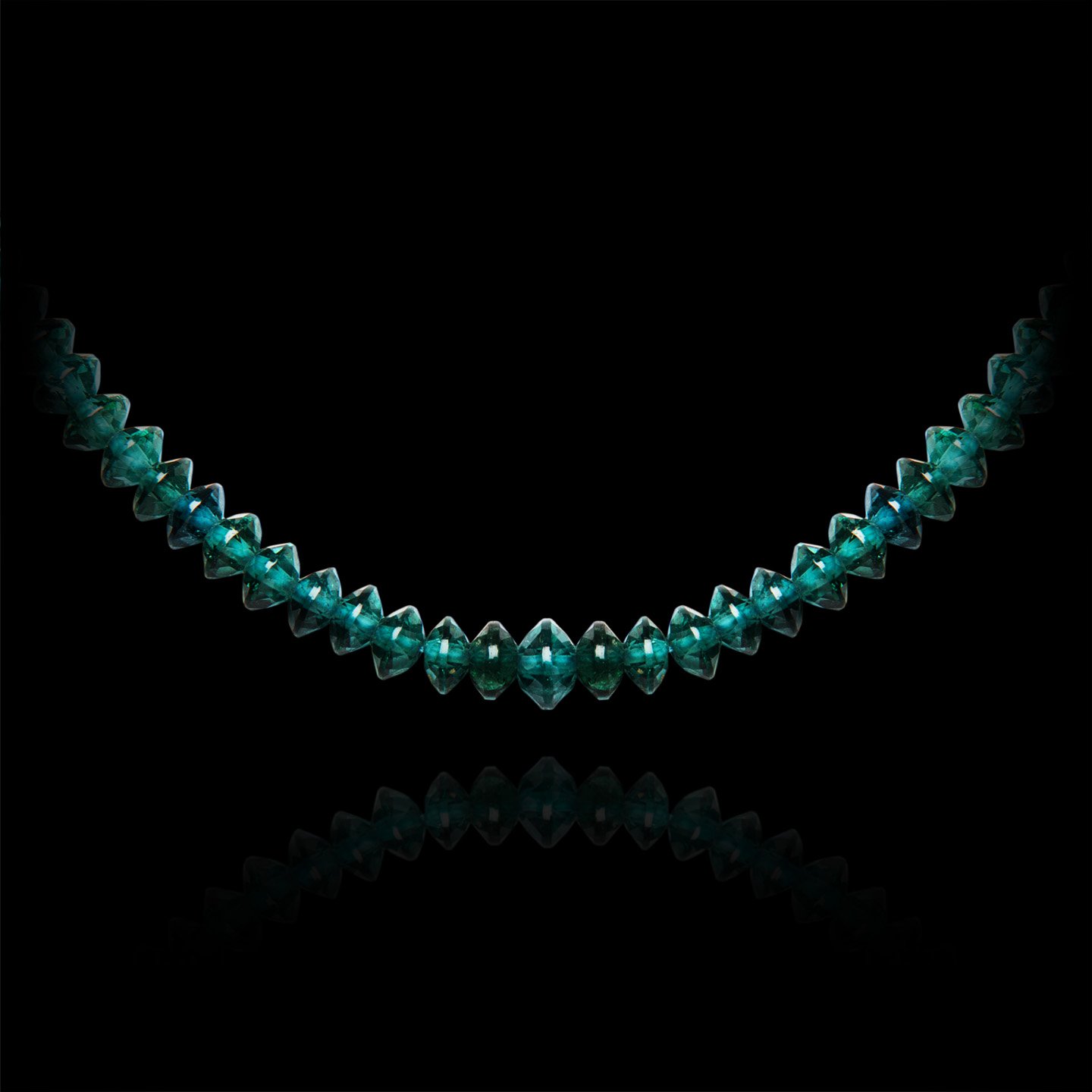 This luxurious beaded strand has been handcrafted using one of the more rare and coveted of tourmalines — the deep blue indicolite tourmaline.
