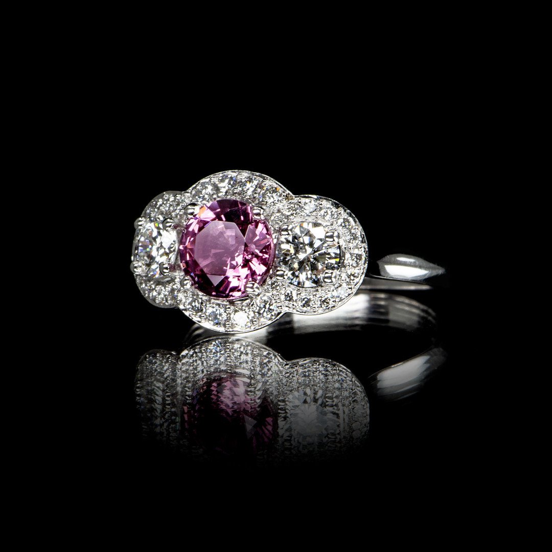 This romantic French vintage style ring features a sparkling pink tourmaline flanked by two diamonds and surrounded by smaller diamonds in an 18ct white gold handcrafted cluster setting.