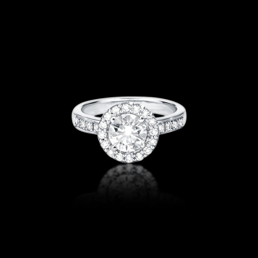 - Diamond claw set cluster (halo) setting in 18ct white gold with a diamond grain set band in 18ct white gold.
