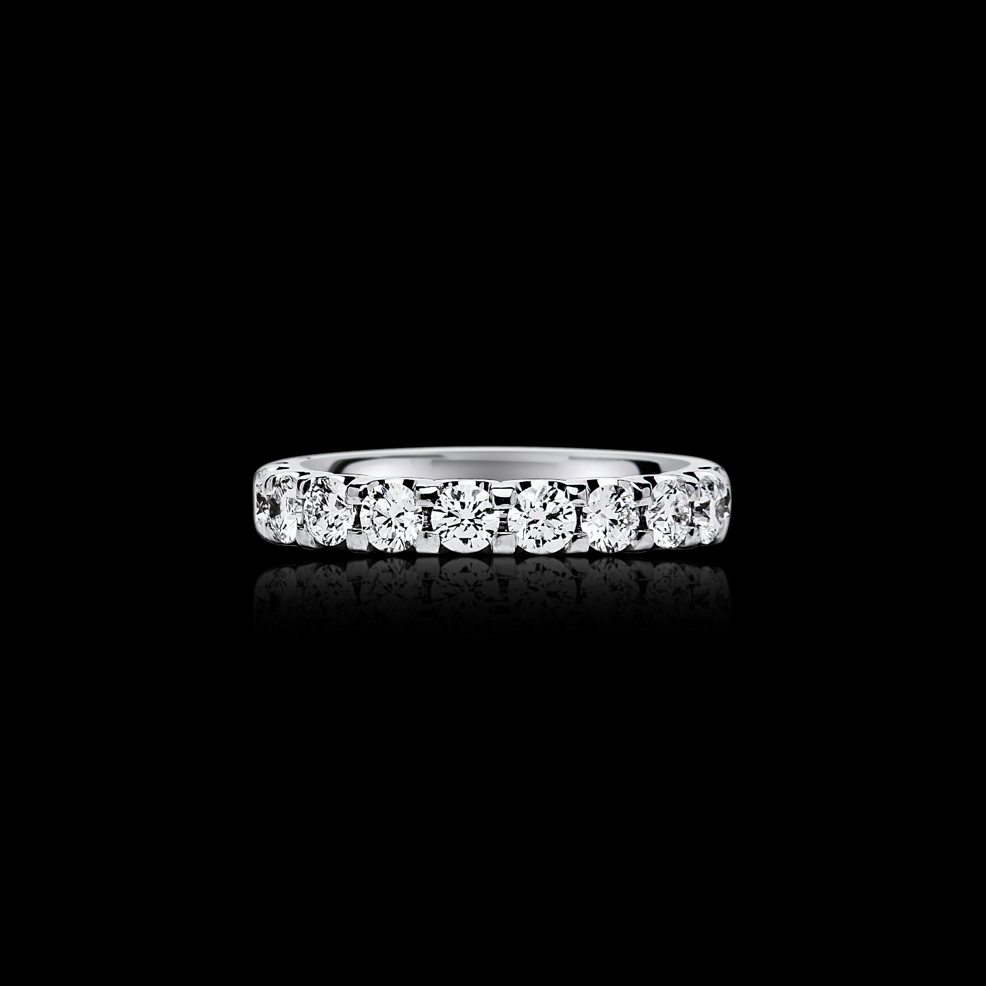 This classical ring (or band) features a row of round brilliant cut diamonds in a scalloped shared claw setting. The setting is elegantly finished with a curved band.