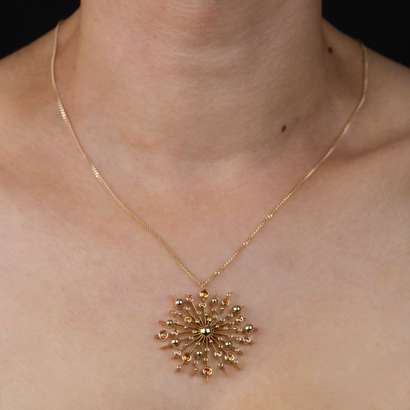 This radiant sunburst pendant and chain from the intricate Soleil Collection features dappled accents of orange sapphire in warm yellow gold.