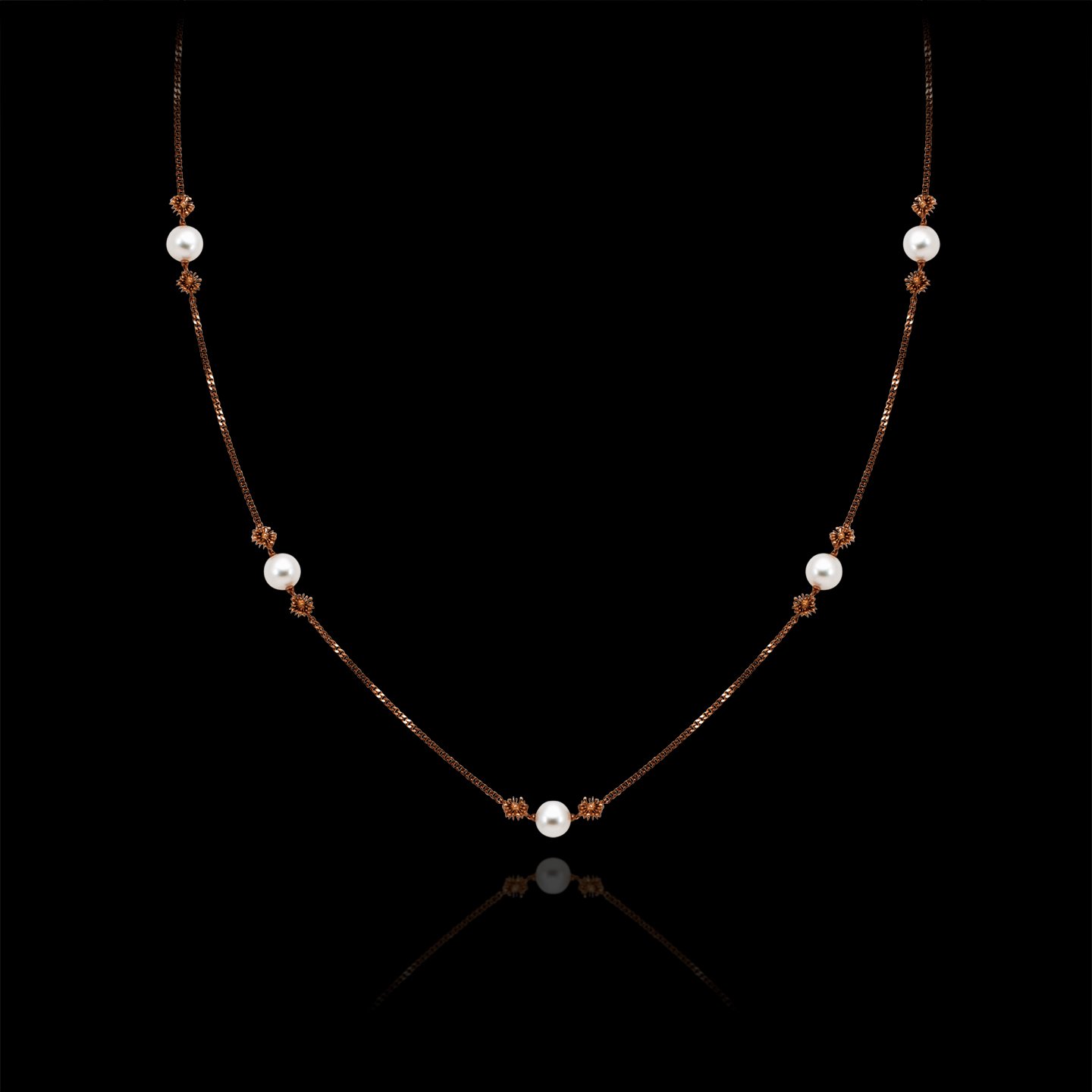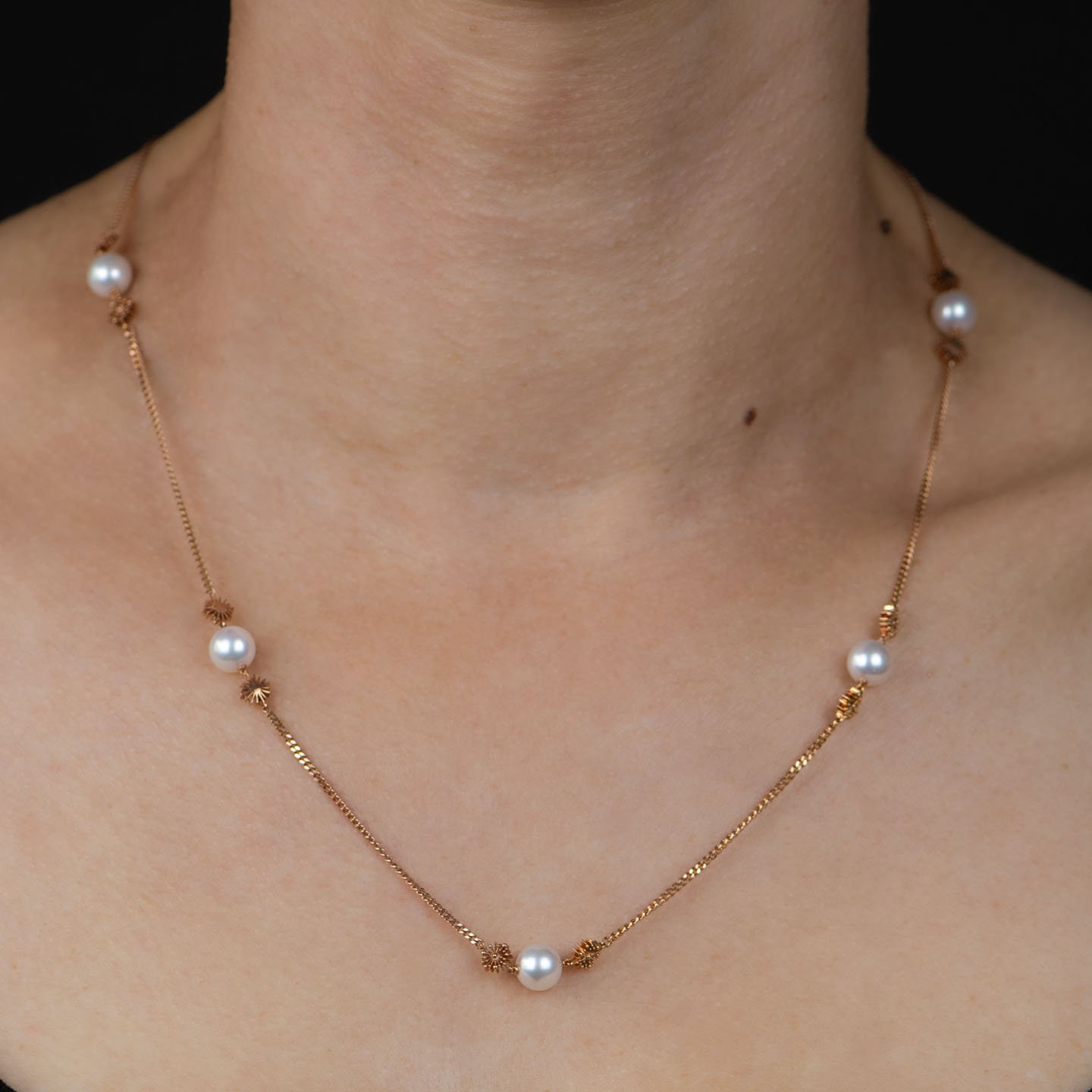 This delicate rose gold necklace from the Soleil Collection exudes timeless French style with its luminous freshwater pearls and fine sunburst motifs.